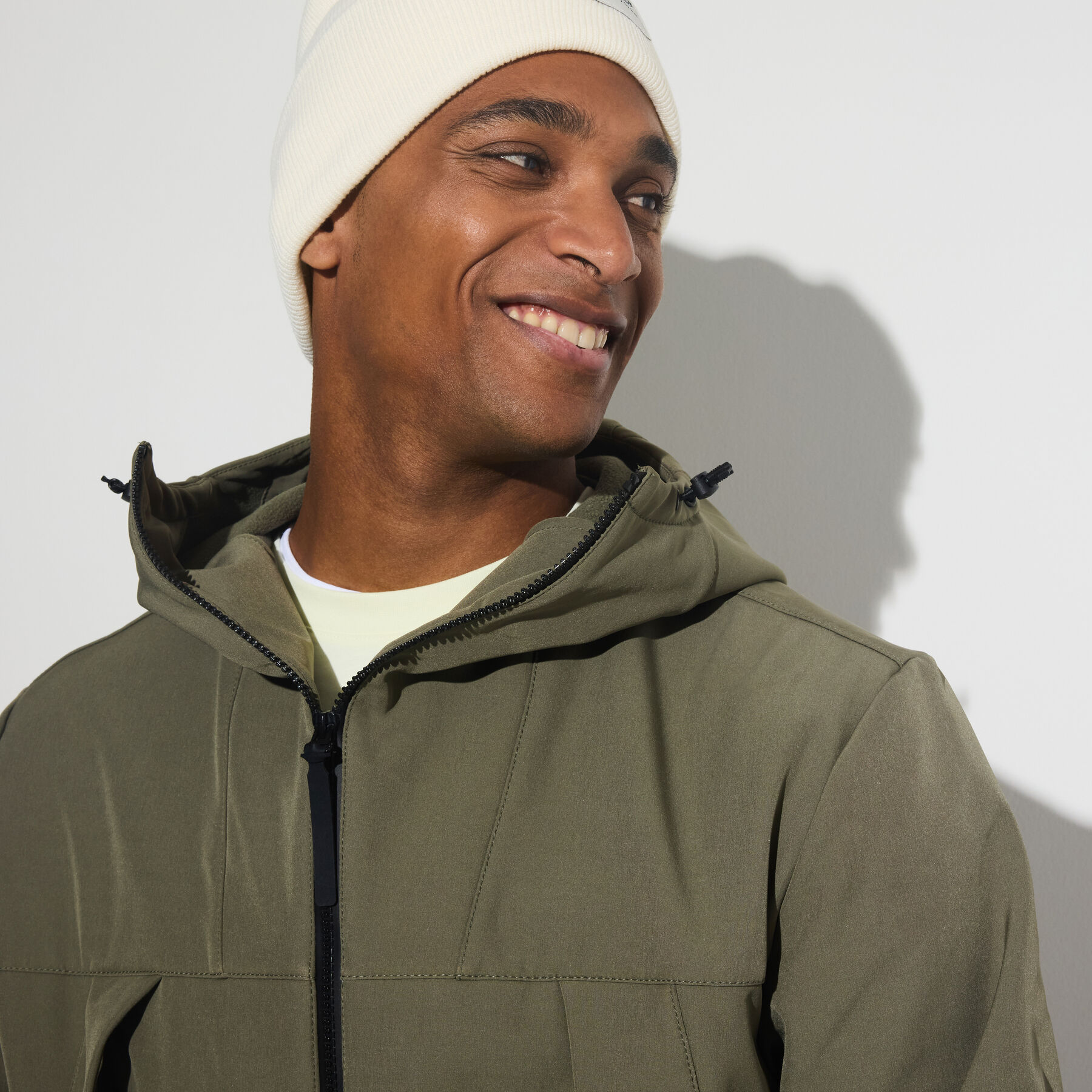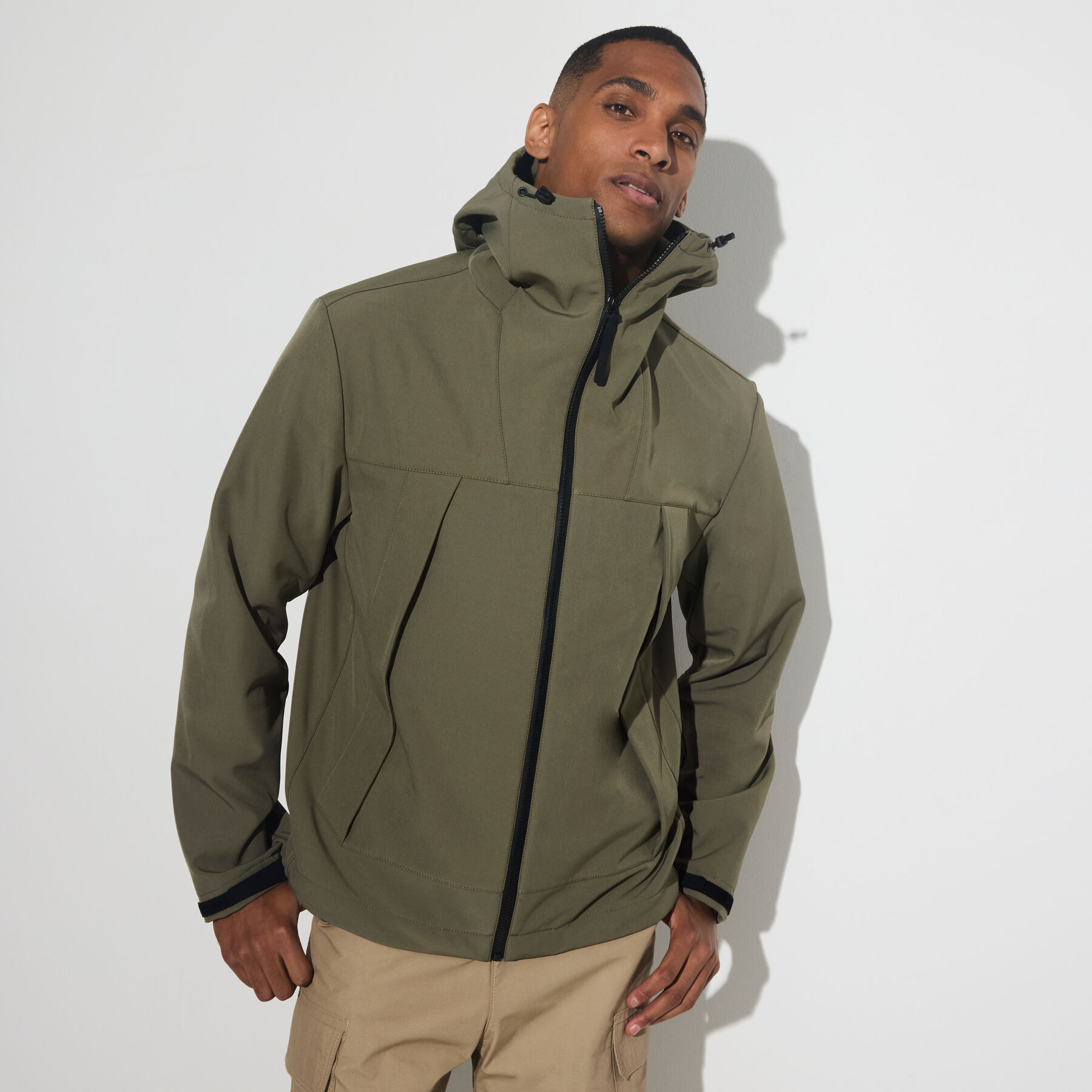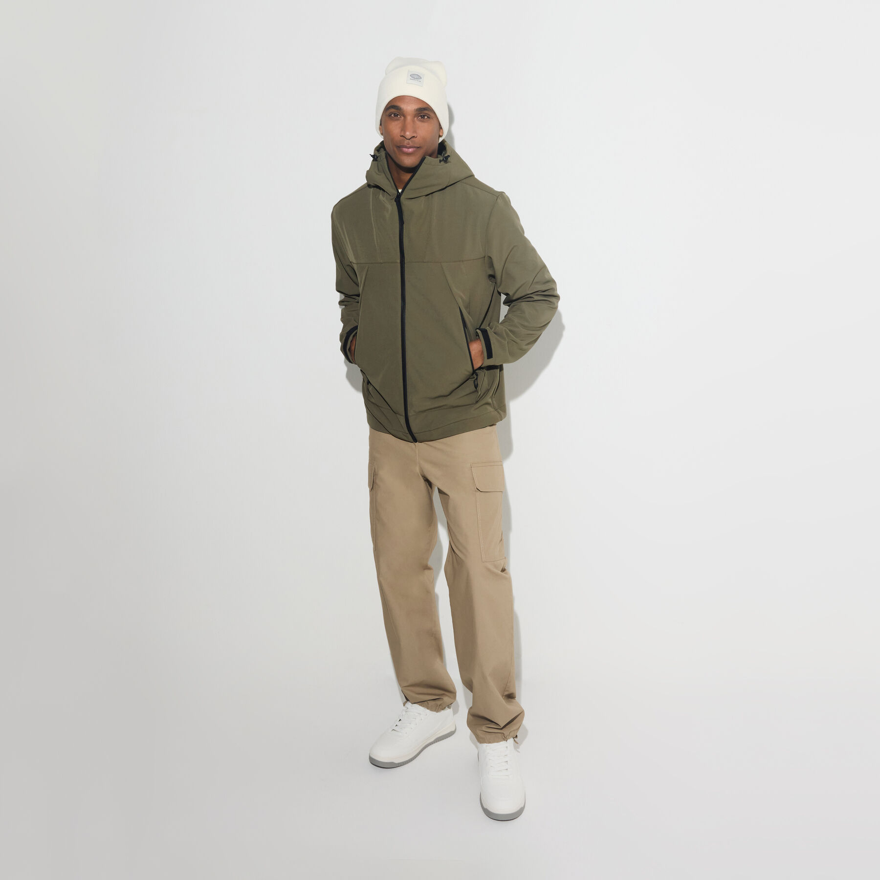 Envie d’un blouson à la fois stylé et pratique ? Ce blouson softshell à capuche est idéal pour un look décontracté. C’est LA pièce indispensable du vestiaire masculin. Matière softshell respirante et déperlante : traitement appliqué sur la matière permettant à l’eau de ruisseler et de ne pas la pénétrerCapuche non amovible avec système de resserrageDoublure polaire89% de polyester recyclé.Tissu stretch pour une liberté de mouvement totaleFermeture zippée2 poches zippées sur le devantPoignets réglables par velcroPoche intérieure zippéeSystème de resserrage à la baseNiveau de chaleur : chaudCette veste à capuche se marie parfaitement avec un t-shirt blanc pour un look décontracté. Pour une allure plus habillée, associez-la à une chemise et un pantalon chino. Le pantalon cargo noir complète le look décontracté et peut être facilement remplacé par un jean.Le mannequin mesure 1m86 et porte du L.