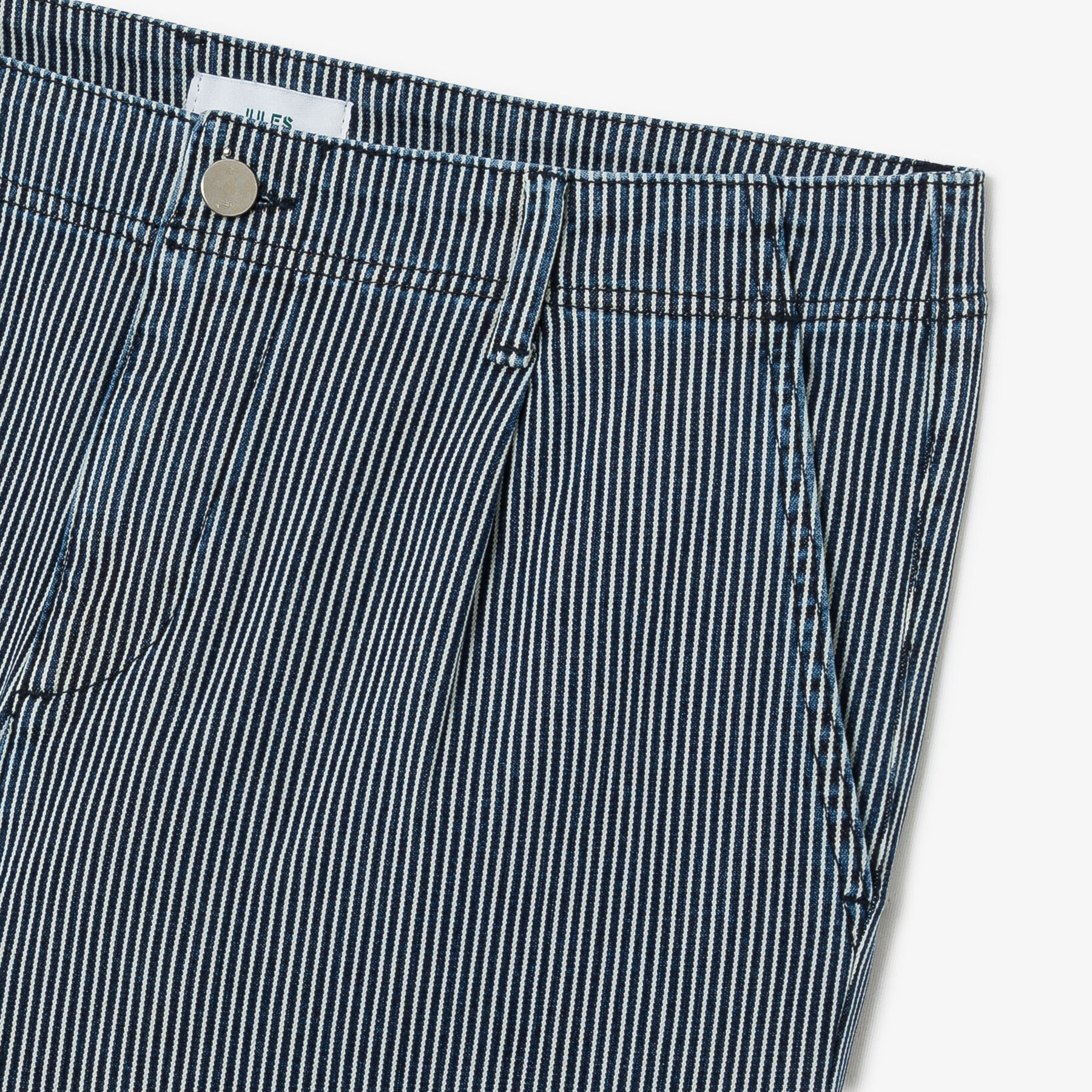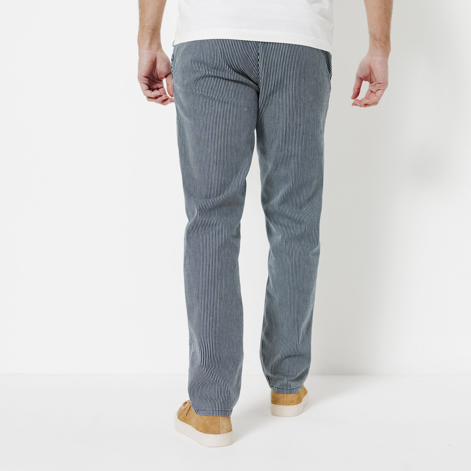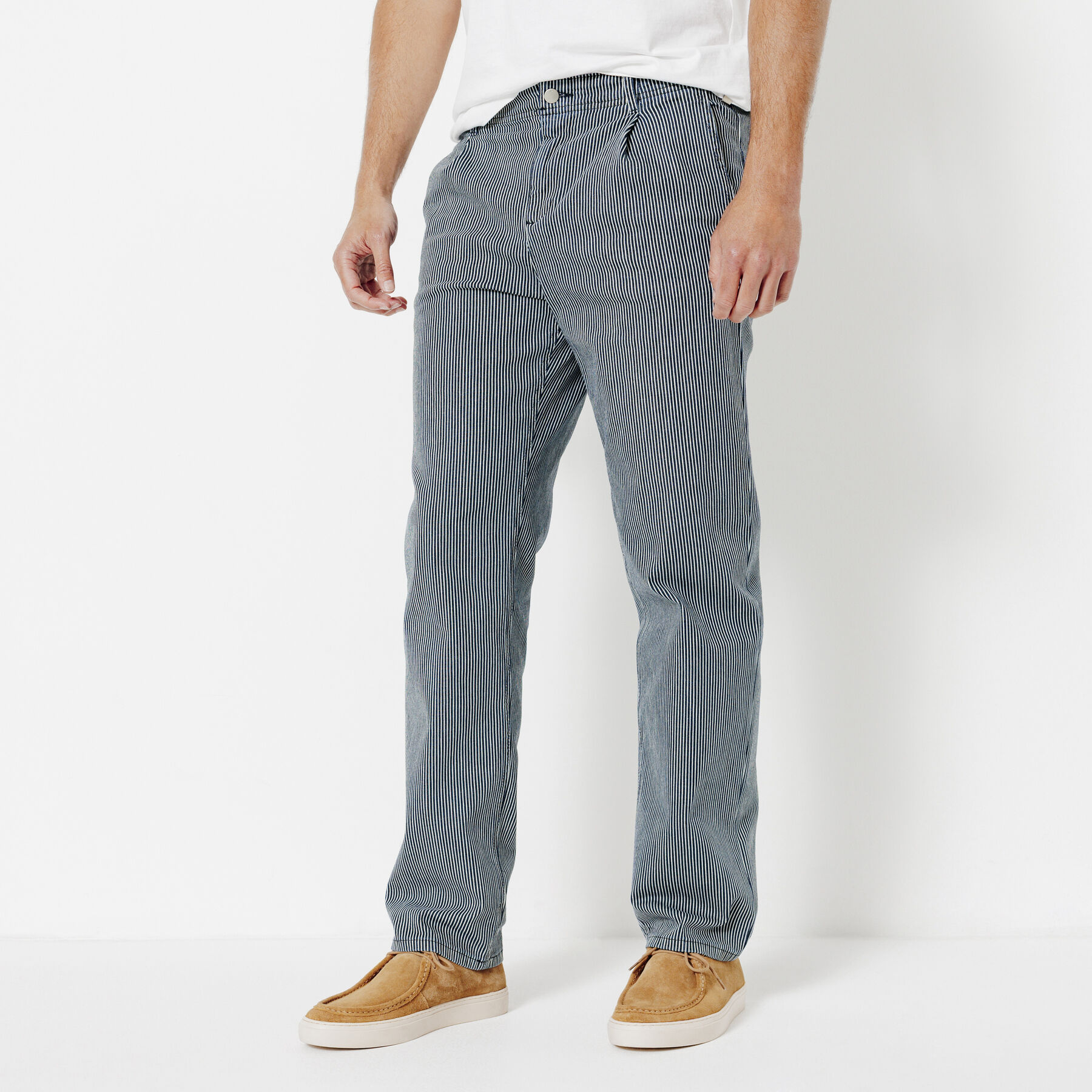 Adoptez un look décontracté et tendance avec ce jean loose à plis rayé. Sa coupe loose et ses détails soignés en font une pièce maîtresse de votre garde-robe.Coupe loose : large à la coupe ample du bassin jusqu’au bas de jambePliures marquées sur le devant2 poches italiennes à l’avant2 poches passepoilées à l’arrièrePassants pour ceintureFermeture zippée100% coton pour un confort respirantLongeur d’entrejambe : 81 cmEn set avec la veste en jean : 1006402Ce pantalon à rayures verticales se marie parfaitement avec un sweat blanc à col rond pour un look décontracté et tendance. Vous pouvez compléter votre tenue avec des chaussures marrons pour un style élégant et confortable.Le mannequin mesure 1m86 et porte du 40.