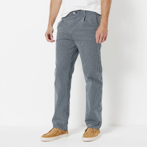 Adoptez un look décontracté et tendance avec ce jean loose à plis rayé. Sa coupe loose et ses détails soignés en font une pièce maîtresse de votre garde-robe.Coupe loose : large à la coupe ample du bassin jusqu’au bas de jambePliures marquées sur le devant2 poches italiennes à l’avant2 poches passepoilées à l’arrièrePassants pour ceintureFermeture zippée100% coton pour un confort respirantLongeur d’entrejambe : 81 cmEn set avec la veste en jean : 1006402Ce pantalon à rayures verticales se marie parfaitement avec un sweat blanc à col rond pour un look décontracté et tendance. Vous pouvez compléter votre tenue avec des chaussures marrons pour un style élégant et confortable.Le mannequin mesure 1m86 et porte du 40.